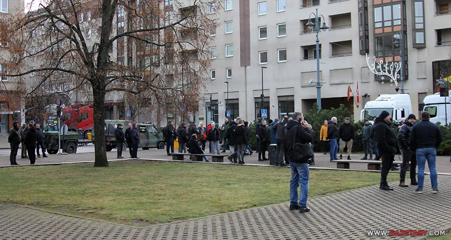 Ровно в полдень на проспекте напротив Сейма Литвы ревут клаксоны — перевозчики напоминают о своих проблемах более, чем громко. Количество участников акции стихийно увеличивается за счет зевак.