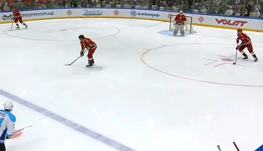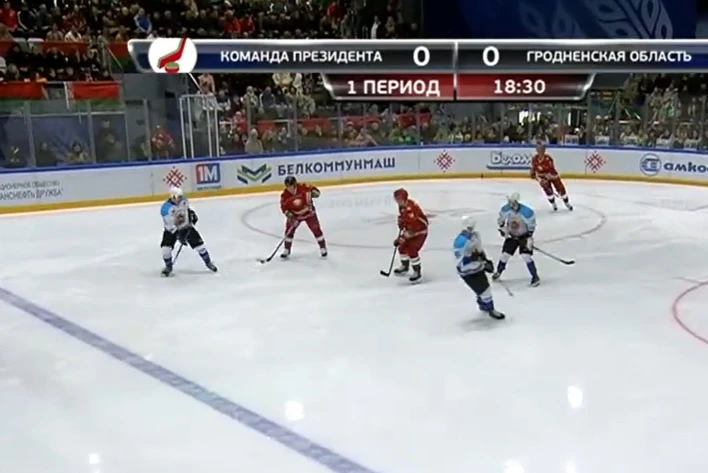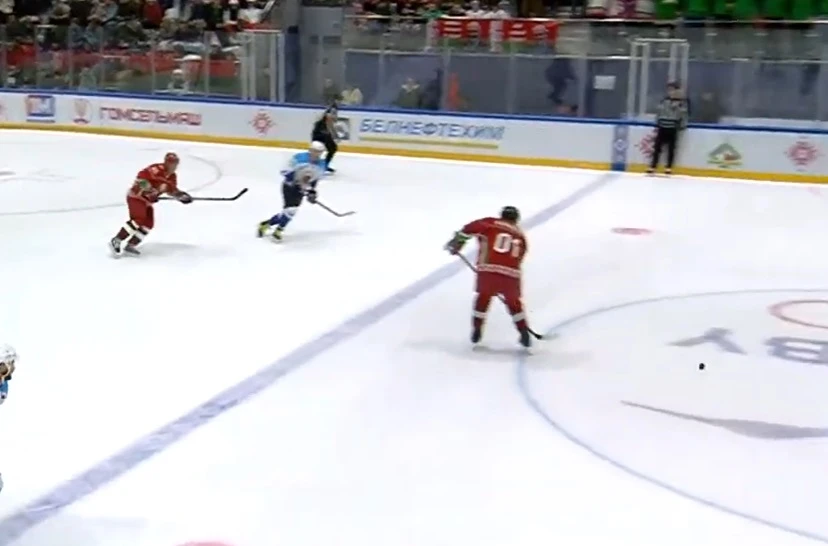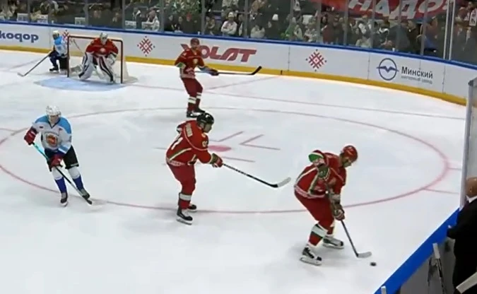За три с половиной минуты до конца первого периода партнеры отдали пас стоящему напротив ворот соперников Лукашенко – появилась прекрасная возможность забросить шайбу. Но правитель промедлил, а затем попал шайбой в соперника. Вторая попытка – попал уже в своего партнера. Эпизод закончился ничем.