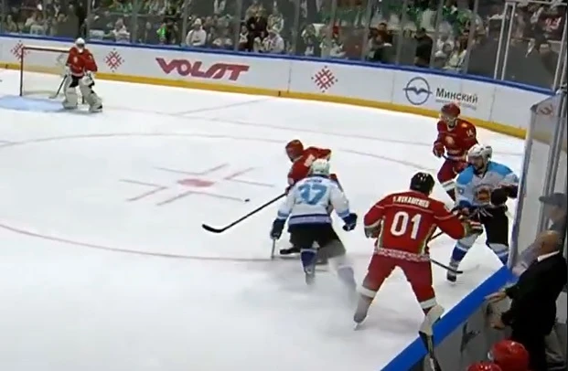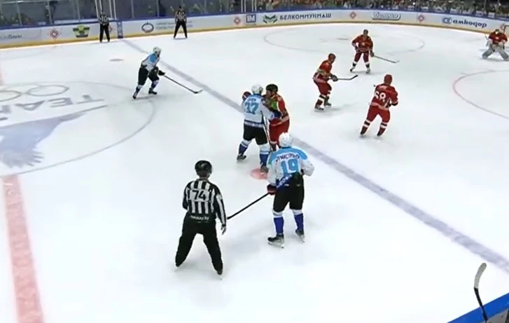 За 7 с половиной минут до конца первого периода произошло непонятное: после вбрасывания Лукашенко словно повис на сопернике: то ли так мешал его движению к воротам своей команды, то ли вновь побоялся упасть.