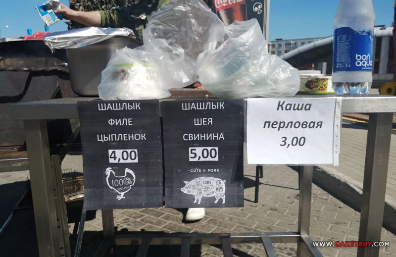 Очередь за солдатской кашей с чаем растянулась на полплощадки. В нескольких метрах от бесплатной полевой кухни такую же кашу с тушенкой можно было попробовать без всяких очередей, но за 3 рубля. Заодно в меню — традиционные шашлыки от 4 рублей за 100 грамм.