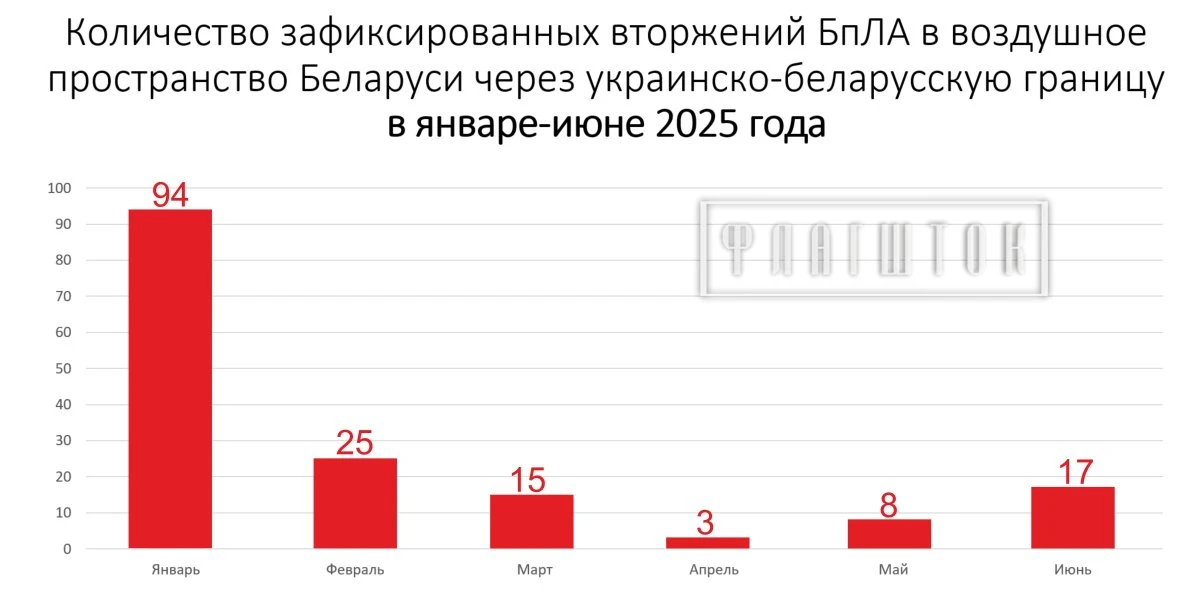 У Беларусь зноў актыўна залятаюць расійскія БПЛА. Як піша Флагшток са спасылкай на ўкраінскія тэлеграм-каналы, што манітораць сітуацыю, толькі ў ноч на 10 ліпеня над тэрыторыяй Гомельскай вобласці праляталі больш за 20 дронаў. Пры гэтым за ўвесь папярэдні месяц, чэрвень, было зафіксавана толькі 17 выпадкаў залётаў беспілотнікаў, адзін з іх упаў блізу населенага пункта.