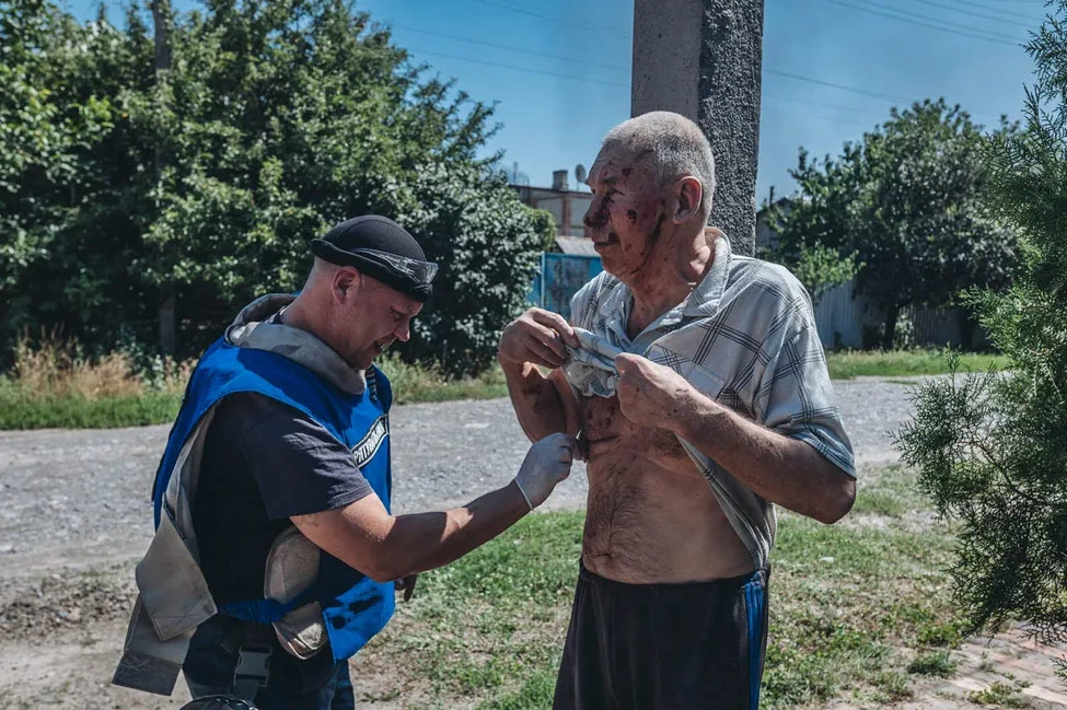 Фотофакт: украинский спасатель оказывает помощь жителю Бахмута, который был ранен в ходе российского обстрела.