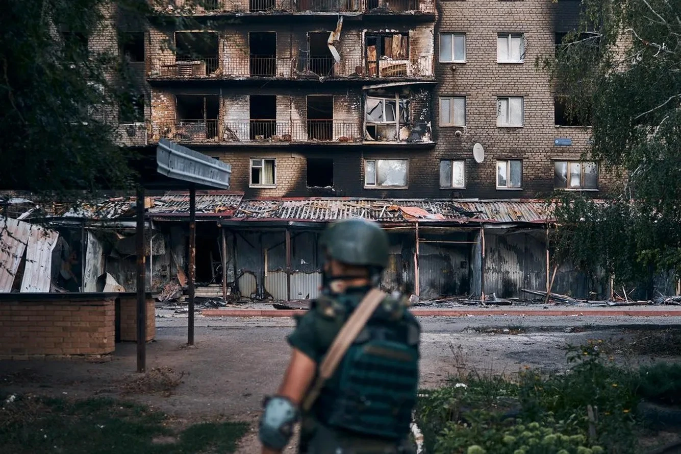 Фотофакт: украинский военный на фоне разрушенного жилого дома в Северске. До войны в городе жили около 10 тысяч человек, но он был практически полностью разрушен в ходе боев, которые продолжаются больше месяца.