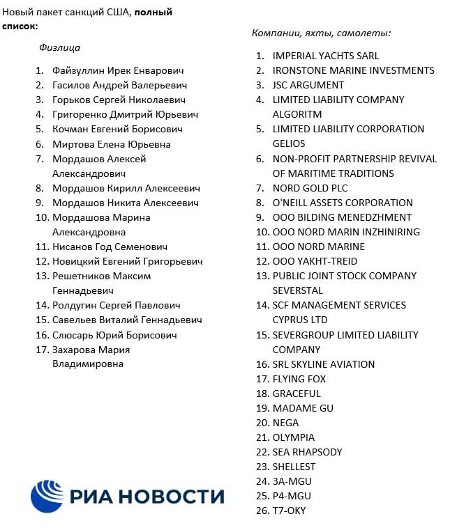 Тем временем, Минфин США расширил санкционный список против России. «Черную метку» получили Мария Захарова и еще 16 россиян.