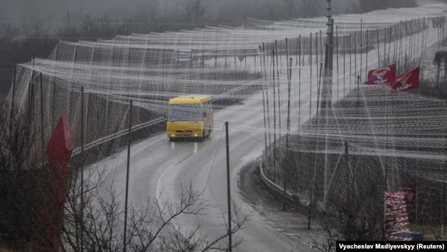 «60 км дороги из Харьковской области до Славянска идут по «антидроновому туннелю»: вся дорога накрыта сеткой, натянутой над землей на высоте нескольких метров. Сетка мешает российским дронам атаковать украинские машины и спасает жизни людей.