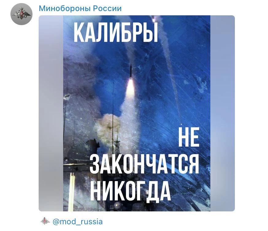 Минобороны России на фоне массированного обстрела территорий опубликовало в своем телеграм-канале изображение с надписью: «Калибры не закончатся никогда».